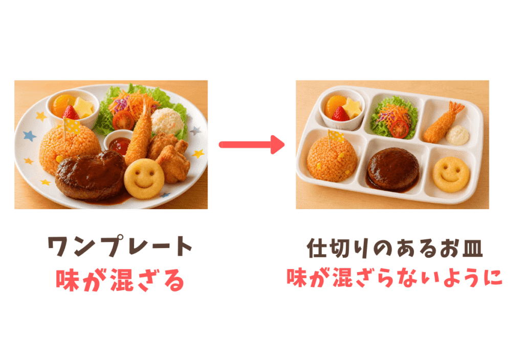 いろいろな色の食材が一つのお皿に入っていたり、食材どうしが触れ合っていたりするだけで、食欲が落ちてしまうことがあるのです。